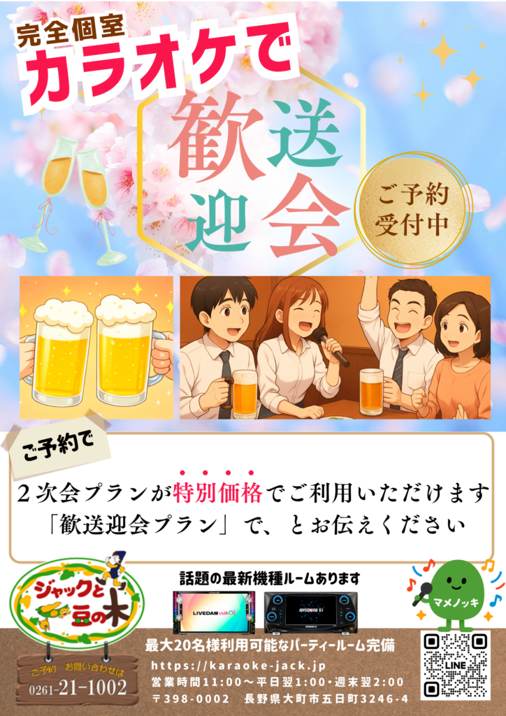 JR信濃大町駅から徒歩3分にある駐車場完備のカラオケボックス ジャックと豆の木 ご予約・お問い合わせは0261-21-1002まで!